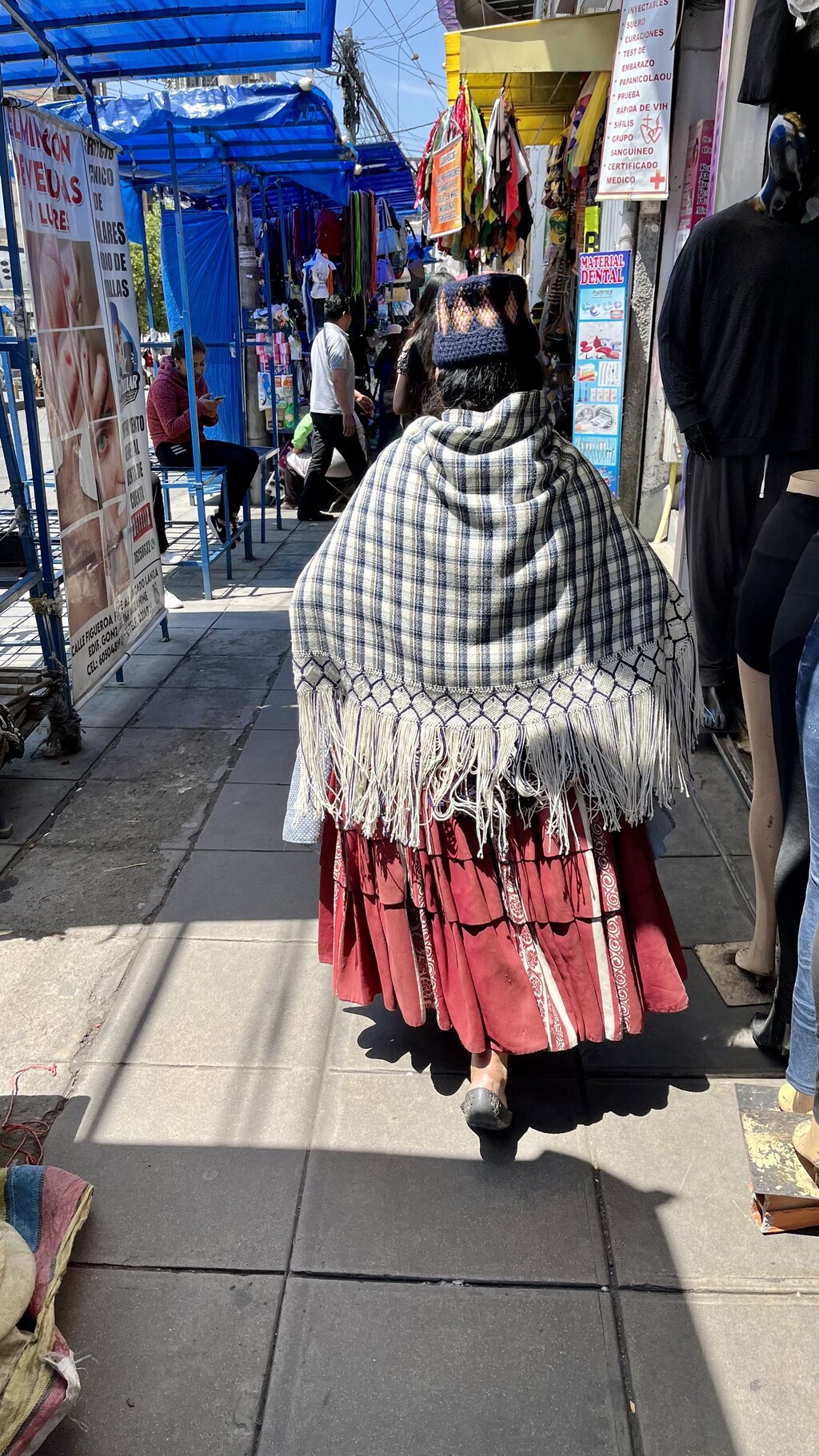 Meist tragen die Cholitas mehrere Schichten Röcke, ein gestricktes Oberteil oder Schultertuch und einen schlichten, aber sehr hohen Hut, den sie häufig mit Schmuck und Broschen verzieren. Außerdem typisch sind die langen, geflochtenen Zöpfe, die den Cholitas über den Rücken hängen. Während man in der Stadt Cusco das Gefühl hat, dass die Leute, die traditionelle Kleidung tragen dies nur tun, um für ein Foto mit den Touristen zu posieren, ist es in Bolivien auch abseits der Touristen viel üblicher und wirkt natürlicher.