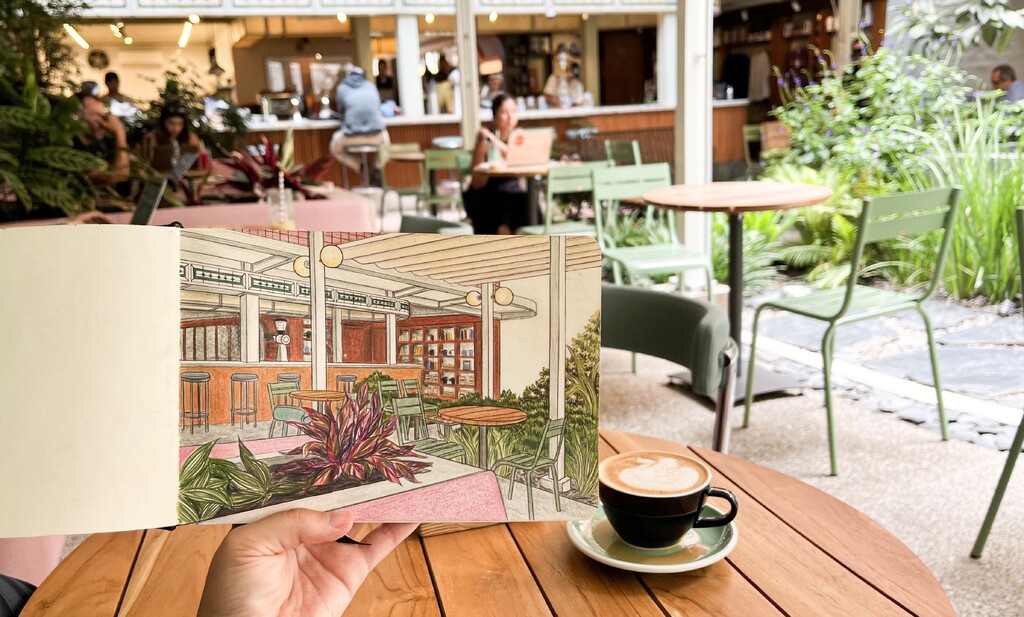Abgesehen von den großen, weißen Buchstaben, die den Namen des Cafes abbilden, ist die Fassade des „Pergamino“ Cafes sehr unscheinbar. Betritt man das Café und durchquert den verspiegelten, im Jugendstil gestalteten Flur, gelangt man zum großen Tresen des Cafés, wo man seine Bestellung aufgibt. Geht man am Tresen links vorbei, steht man kurze Zeit später im hellen, nach oben hin offenen Innenhof und Garten des Cafés. Hier stehen zwischen den tollsten tropischen Pflanzen und einem vor sich hin plätschernden Brunnen, die gemütlichen Tische und Stühle des Cafés. Dieser Innenhof war während unserer Zeit in Medellín definitiv unser Lieblingsort in der Stadt. Im Pergamino Café gibt es nicht nur sehr guten Kaffee und alle möglichen Kaffeezubereitungsarten zur Auswahl, sondern auch leckeres Frühstück und Mittagessen. Dieser Ort ist also nicht nur für Kaffeenerds, sondern für alle, die gerne entspannt brunchen gehen! Besonders ist am Pergamino Café auch, dass sie ihre Kaffeebohnen von kleinen, unabhängigen Kaffeebauer:innen in Kolumbien beziehen und dadurch kleine Familienbetriebe unterstützen und fair bezahlen.