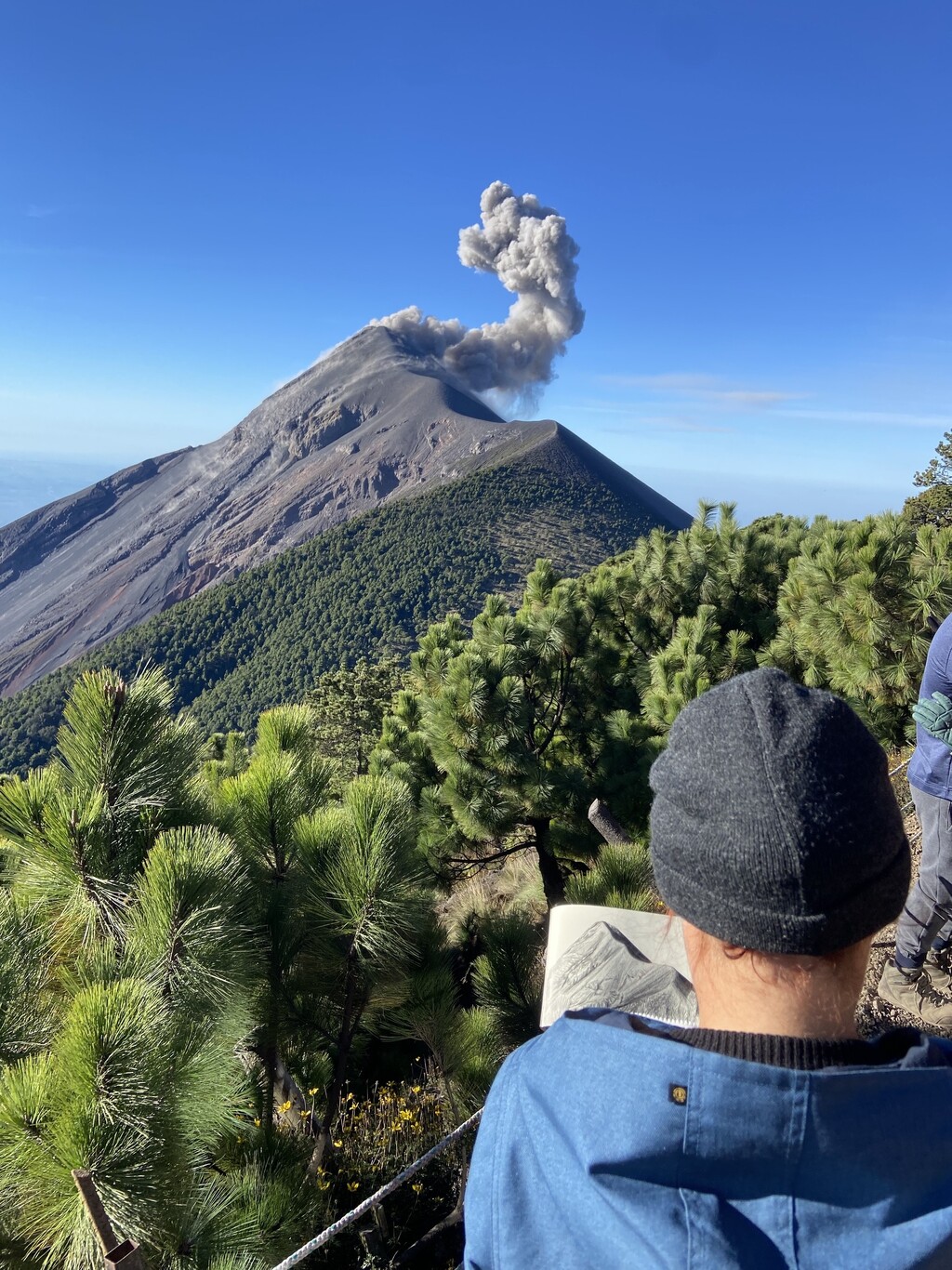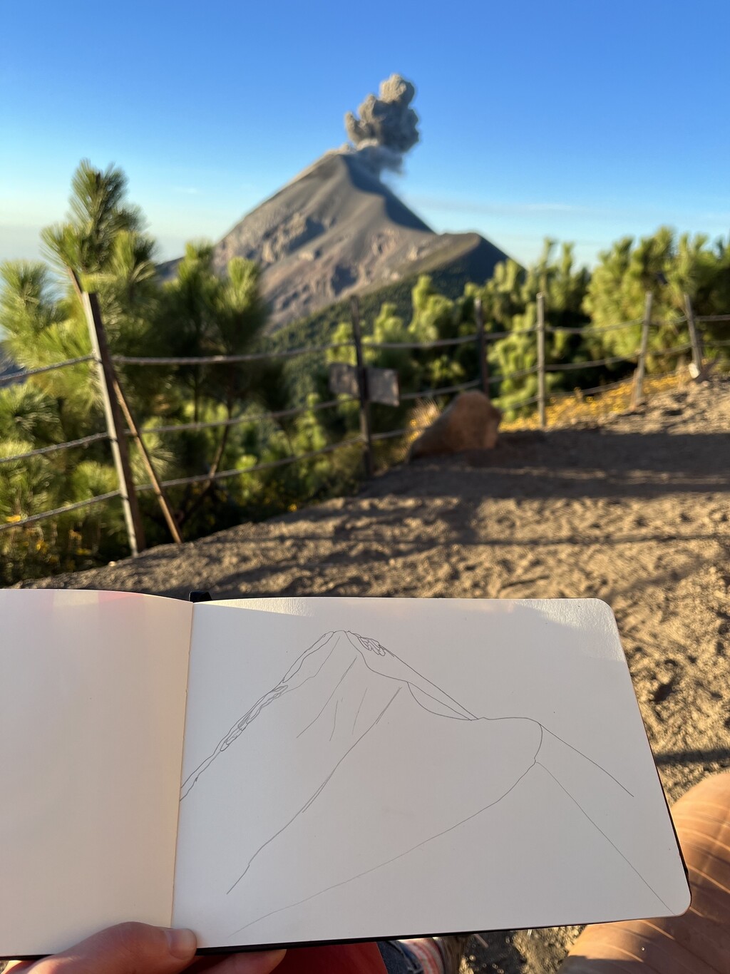 The sunrise the next day was the most beautiful I had ever seen and the view of the surrounding volcanoes and mountains in the orange light was amazing. When the sun had just risen, I decided to sit in front of the hut with my sketchbook at 6:30 a.m. and draw the volcano on the other side of the basecamp. I enjoyed the peace and quiet so much, as there was nothing going on in the base camp that early in the morning. I was able to create my sketchbook drawing in the most beautiful (but really cold) setting ever. That weekend and this peaceful drawing session was the most beautiful experience of our 1-year-long trip.