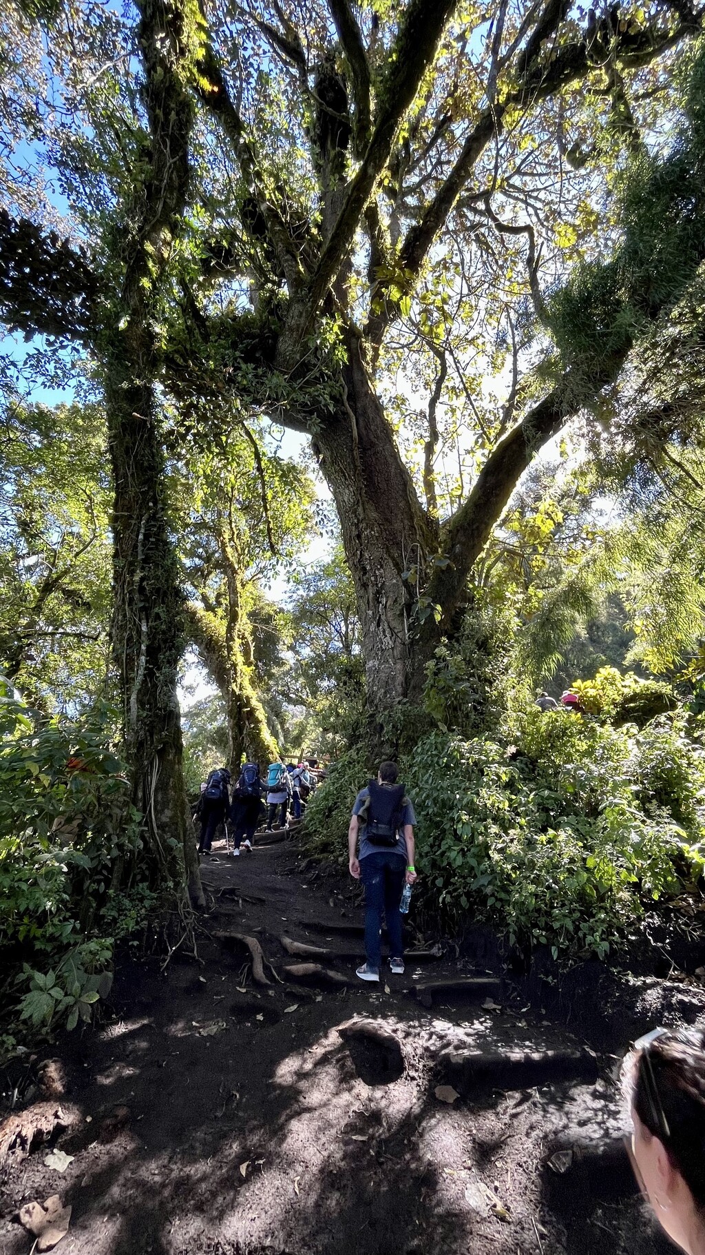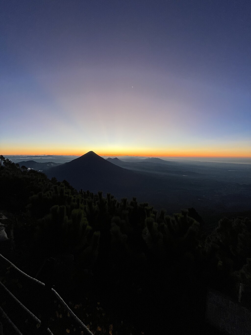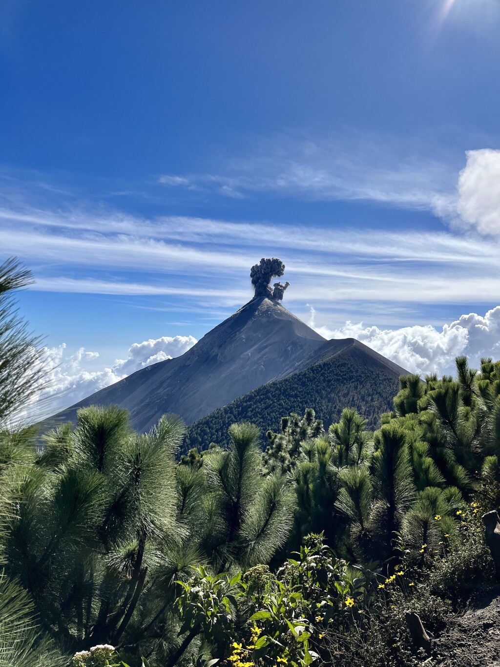 On the day of the hike we took a bus from Antigua to the small village where we started the hike, which was at an altitude of around 1600 meters above sea level. The base camp, which we were supposed to reach that same day, was at an altitude of 3,600 meters above sea level, so we had to hike up a total of 2,000 meters of height. The climb up the Acatenango was very strenuous, as the path was always steep and you mostly walked on scree and sand, but it was still doable for us. As soon as you reach the 3000 meters above sea level mark you notice that breathing is a bit more difficult so we took lots of breaks. We reached the base camp at 3600 meters above sea level in about 5 hours during this hike we passed a wide variety of vegetation zones. You start between wide, flat fields, then you reach a kind of tropical, densely vegetated rainforest, then you get into a dry coniferous forest and finally you are above the trees at an altitude of over 3000 meters and you can see all the trees, mountains and even clouds from above. When we arrived at the base camp all tired and exhausted, we had a great view of the huge Fuego volcano opposite the base camp, which seemed so much closer than expected. The moment we entered the base camp, we suddenly heard a deep, loud rumbling that sounded like loud thunder. However, with sunlight and clear visibility that day, it was not thunder, but rather the Fuego volcano, which catapulted a huge cloud of ash into the air a few seconds after rumbling. What an impressive reception at Basecamp! The volcano grumbled a bit, spewed out more clouds of ash and a few minutes later it was quiet again and the cloud of ash dissolved completely. We spent the next few hours in camp (by now it was afternoon) having lunch and enjoying the sun and the gigantic view. At very irregular intervals, the volcano began to grumble slightly and spew clouds of ash. Between eruptions the volcano was completely silent.