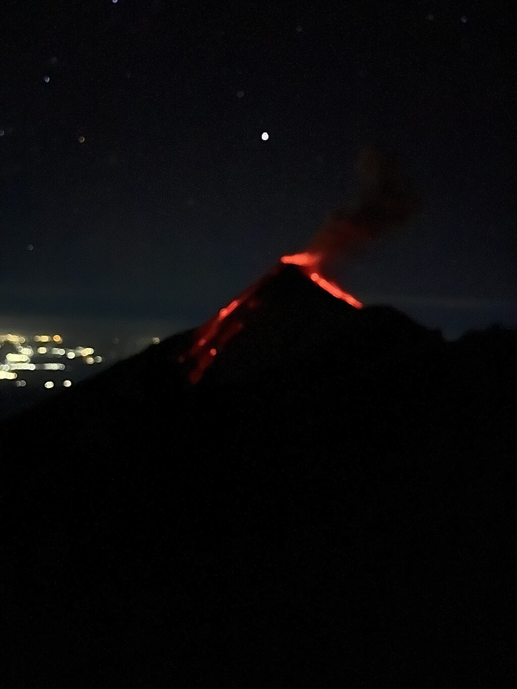 A few hours later the sun had set, which meant that it quickly became very, very cold in the base camp as we were at an altitude of 3600 meters above sea level. Luckily our guides quickly made a campfire, cooked a delicious warm dinner and even gave us a pack of marshmallows and sticks so that we could comfortably grill marshmallows on the mountain at an altitude of 3600 meters. A crazy situation and a luxury considering that the guides had to carry all this food and the water for cooking dinner in their backpacks up the mountain. A few hours passed in which the volcano did not make any sound at all, until suddenly a loud rumbling could be heard again and we could actually see some small lava flows in the dark of the night! The next few hours were the most exciting hours of our entire trip, as we were able to see several small explosions of the volcano and lava fountains, which was a totally crazy, impressive and surreal feeling.