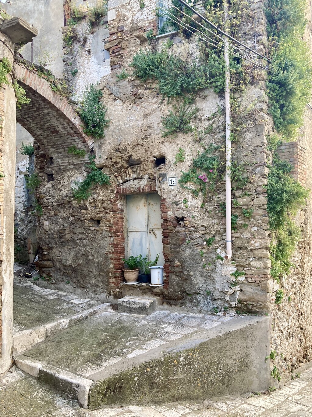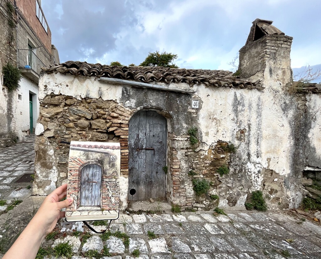 One of our favorite things to do in Grottole was to take a walk through the many small streets in Grottole after work and admire the impressive houses – whether inhabited or derelict. The blue wooden door in my illustration is very close to our accommodation. The dilapidated houses in Grottole have their very own charm and despite the falling plaster you can still see how beautiful and special these houses once were.
