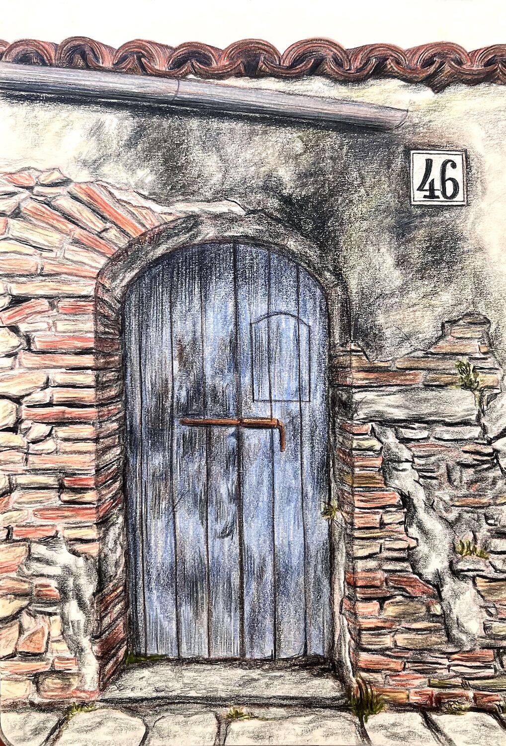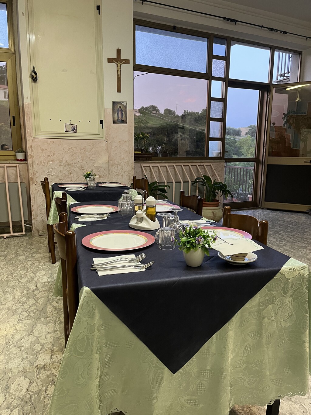 The second room is furnished as we would imagine the living room of an Italian grandma. The walls are covered with pink wallpaper and decorated with images of the Virgin Mary and wooden crosses. Wall units made of dark wood, in which glasses and decanters are kept, line the walls. The tables are lovingly laid – napkins, cutlery and colorful plates are laid out on two tablecloths in blue and light green with a floral pattern.