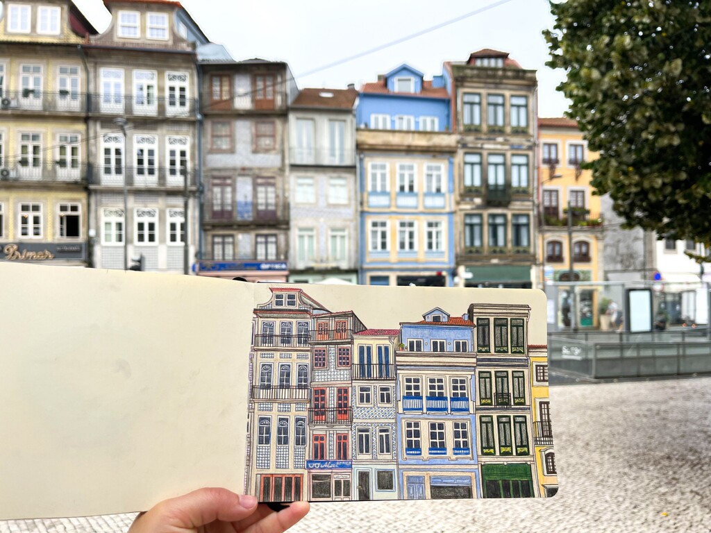 My drawing here shows a street with typical houses with small tiles on the facade near our apartment in Porto.