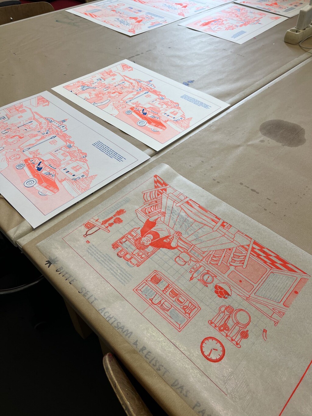 The technique’s analog imperfections become part of the visual charm. Working with vibrant fluorescent orange ink I created bold yet warm imagery with minimalist restraint.