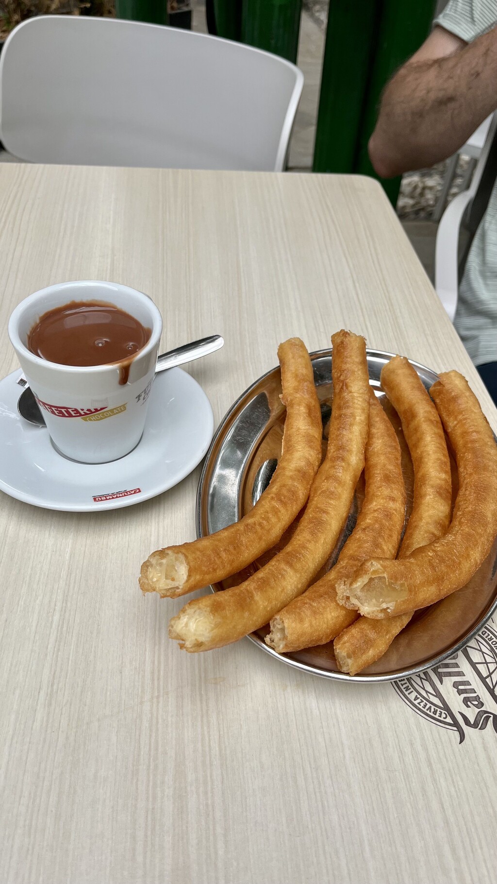 When I was researching online where to find the best chocolate con churros in Granada, an inconspicuous sports bar/café a few minutes from my apartment was mentioned very often. A football cafe where all sorts of football matches are broadcast and people can enjoy fresh churros while they watch. Since I’m not into football at all, I was a bit critical at first, but then I decided to go there anyway as I wanted to try their chocolate con churros and let me tell you: it was so worth it! The bar itself was nothing like what I imagined a typical sports bar would be like. Instead of the dark interior I expected, I found a really nice, bright café with small TVs hanging here and there. Even for me as a non-football fan, this place was just cozy and the TVs and football matches didn’t bother me at all. We ordered some chocolate con churros to share, which later turned out to be a very smart decision – the plate of hot, freshly fried churros was huge. Dipped into a cup of steaming dark chocolate was just incredible!