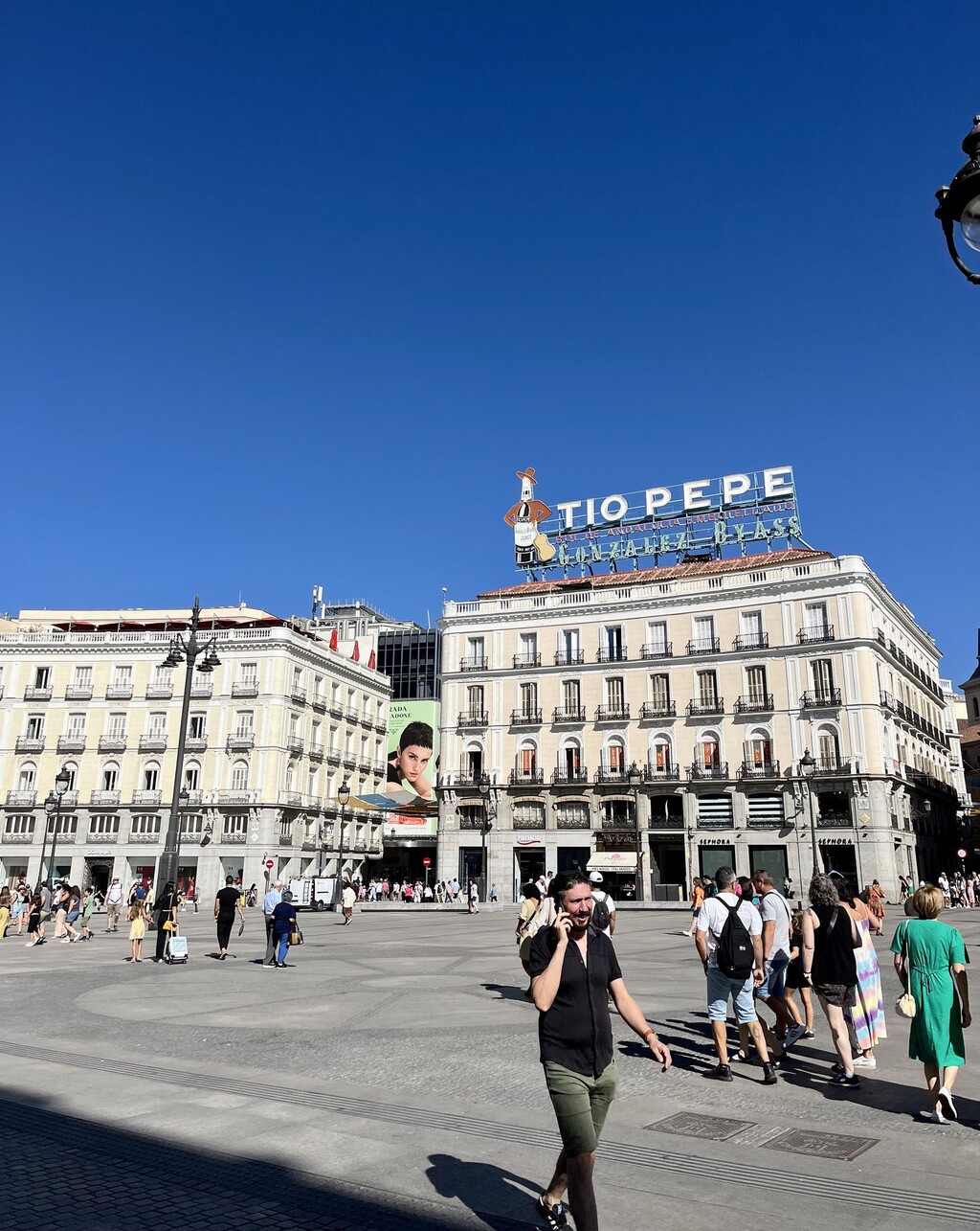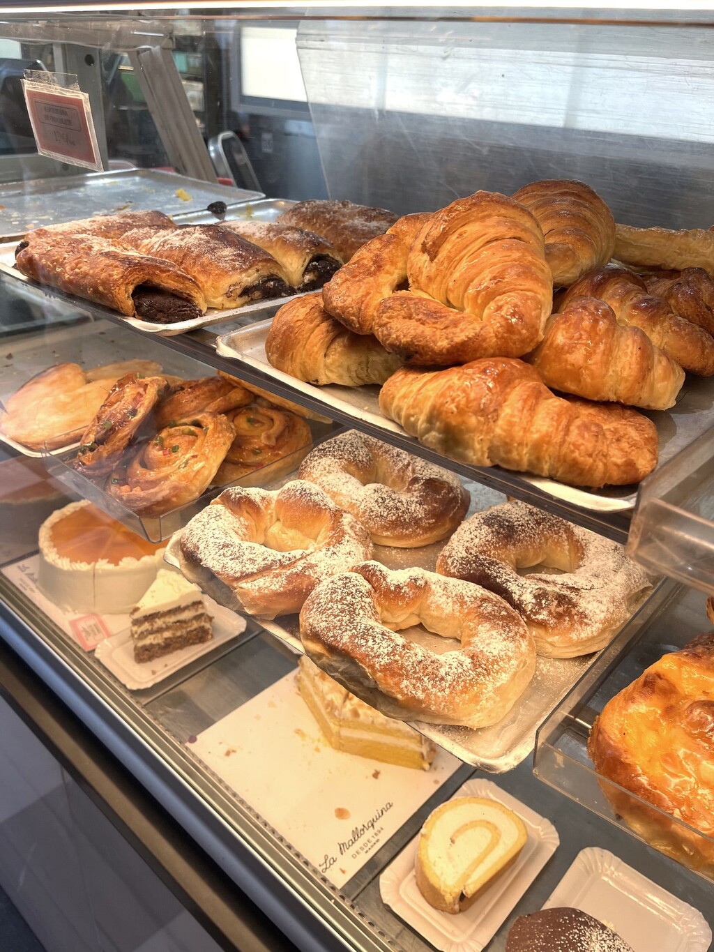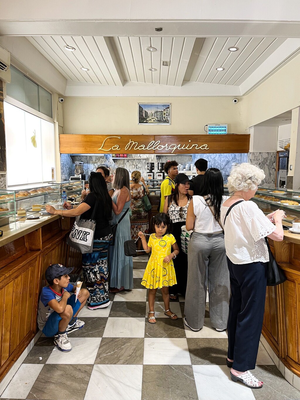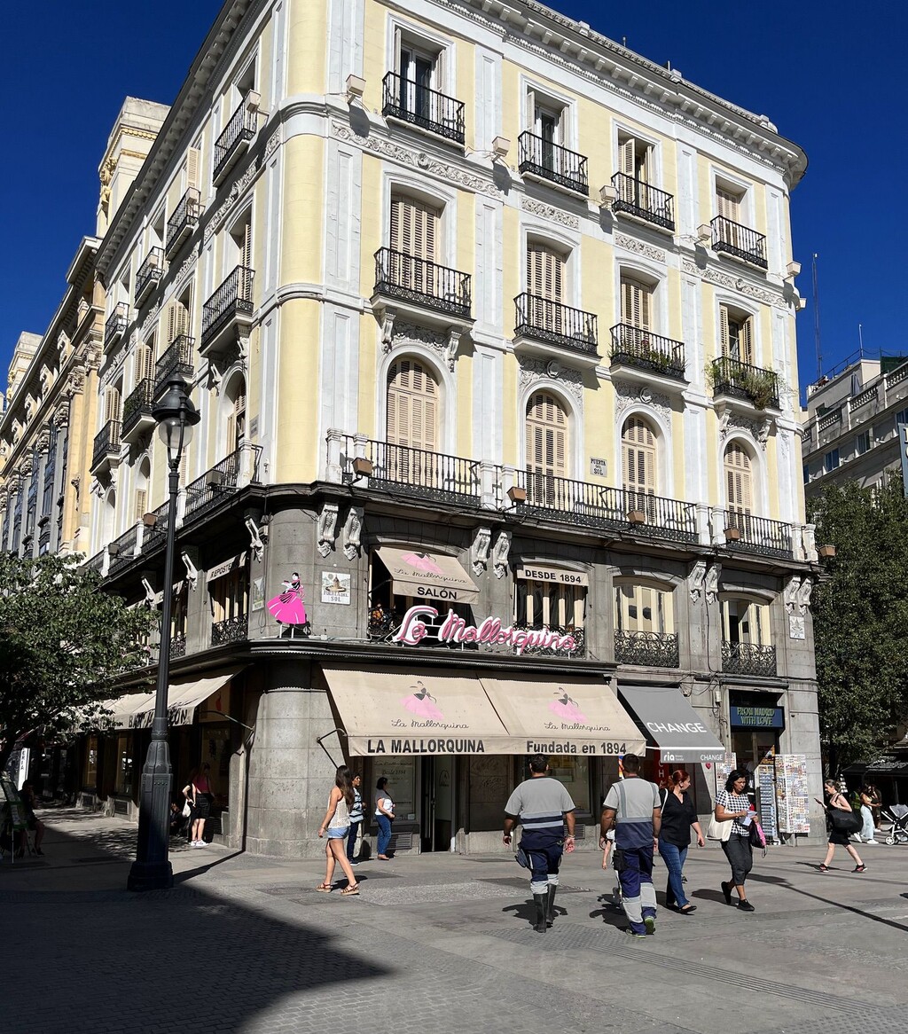 While looking for some good pastries in the city of Madrid, we were recommended what is probably Madrid’s most famous pastry shop: “La Mallorquina” in the center of the city. The facade of the pastry shop can be seen from afar as the café has a bright pink logo and pink awnings. Inside, however, the café has a much simpler and more tasteful interior design than the colorful logo outside suggests.