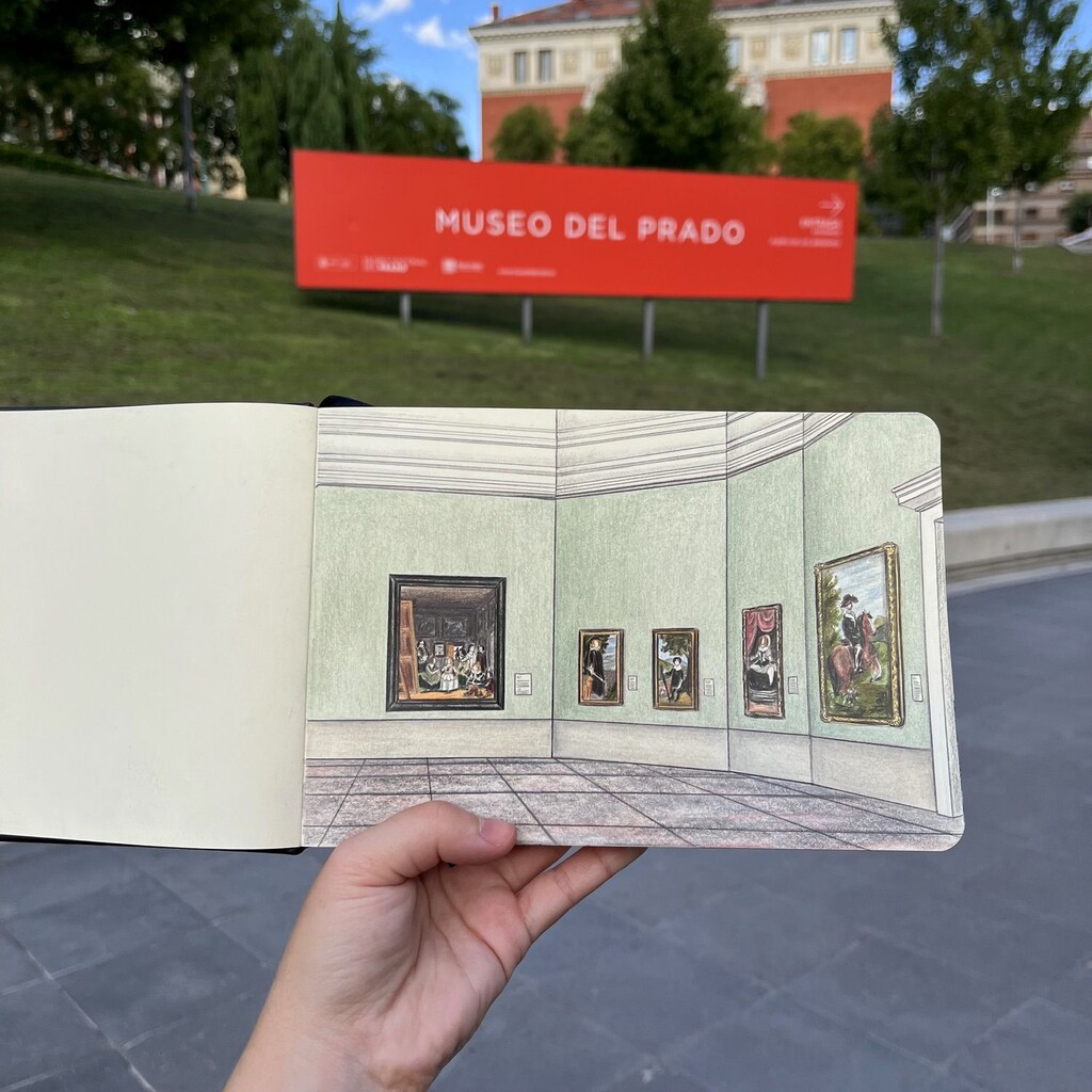 Because there was so much going on in the museum and there were so many visitors, it was impossible for me to draw on site. So my sketchbook drawing of the Prado Museum was actually created a day later at home in my apartment in Madrid. A few days later I walked to the Prado Museum building again to take the photo of my sketchbook in front of the museum that you see here.