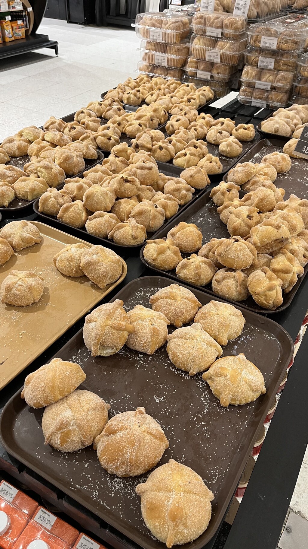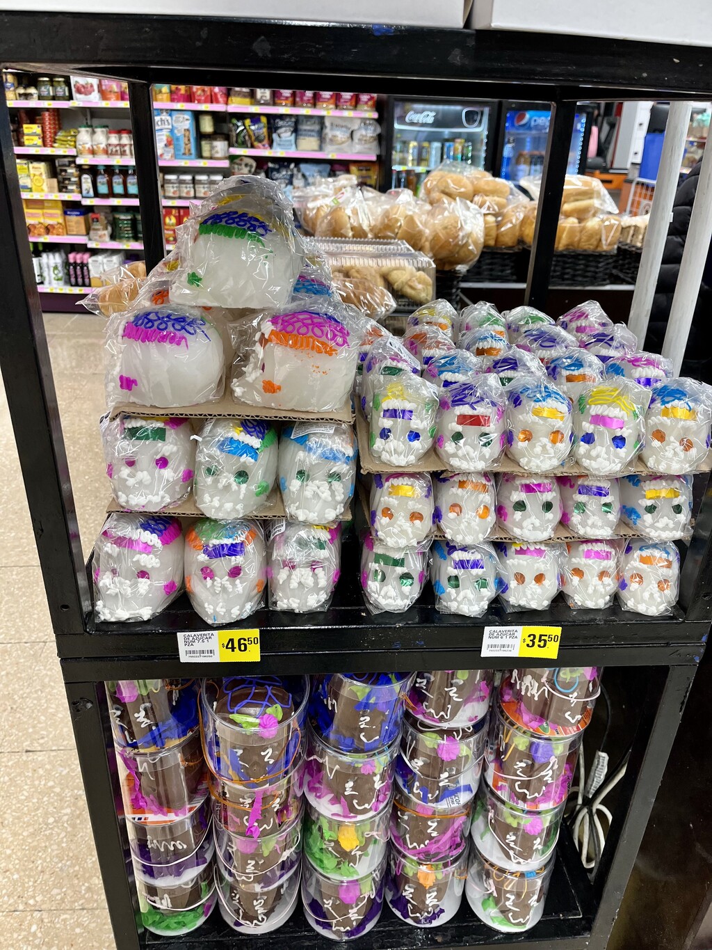 Another type of pastry that Mexicans love is “Pan de Muerto” = “bread of the dead”. Despite the somewhat strange-sounding name (at least for us Non-Mexicans), Pan de Muerto is a delicious, sweet yeast dough roll, which is usually flavored with spices and orange peel. The special thing about this pastry is that the Pan de Muerto is only available around the holiday “Día de Muertos” = “Day of the Dead”. Día de Muertos is considered the most important holiday in Mexican culture and is celebrated on November 1st and 2nd every year. On these days, families remember and honor the deceased of the family who, according to Mexican belief, return to earth once a year (1st and 2nd of November) to visit their families. However, Mexicans deal with death differently than we Germans do and the Day of the Dead celebrations in Mexico are characterized by happiness, parades, brass bands and dancing through the city. Starting mid-October people slowly prepare for the Day of the Dead and so in October and November you can buy “Panes de Muerto” in almost every bakery. Since we really wanted to experience the Day of the Dead festivities, we had planned our stay in Mexico in October and November which meant we not only did attend the Day of the Dead celebrations but we were also able to eat the delicious Panes de Muerto. Now we get why Mexicans love the Panes the Muerto so much!