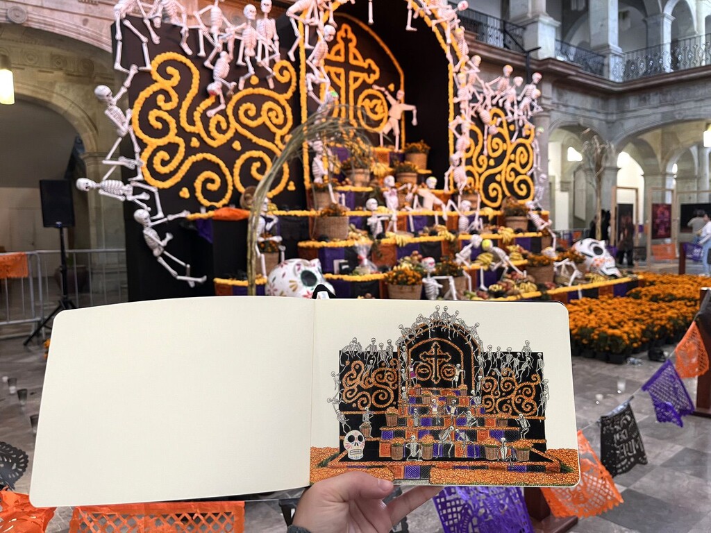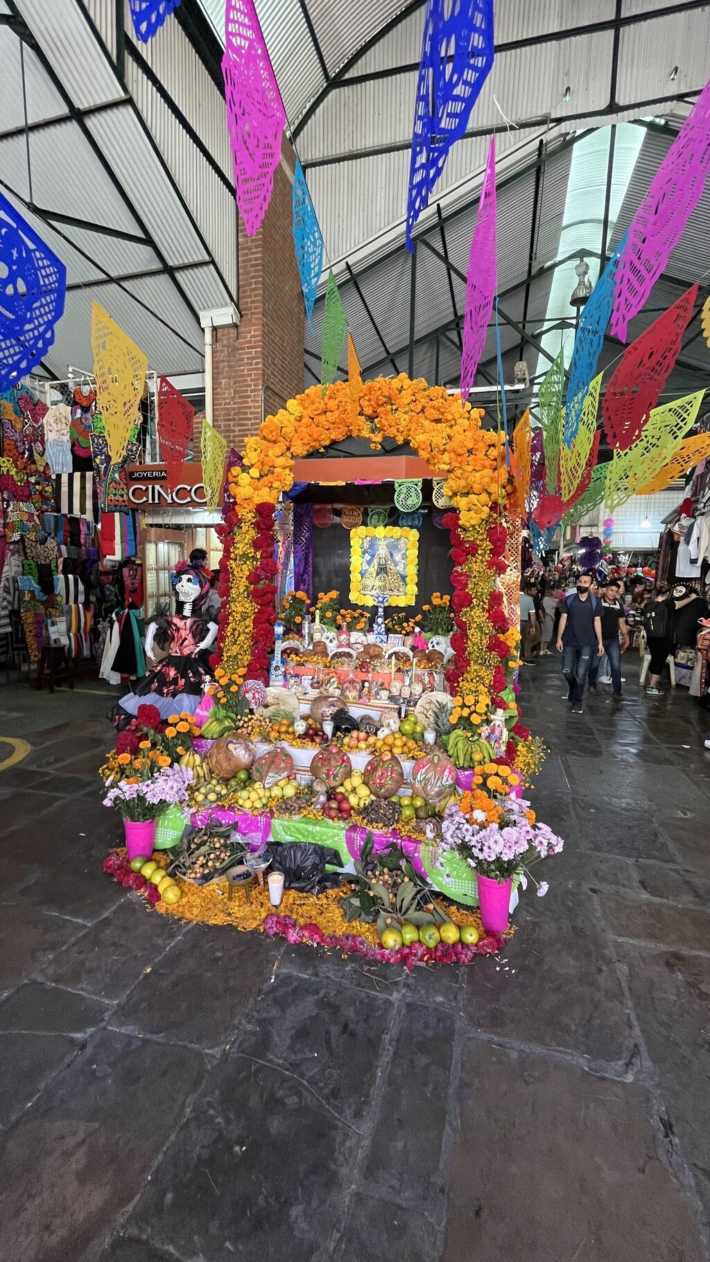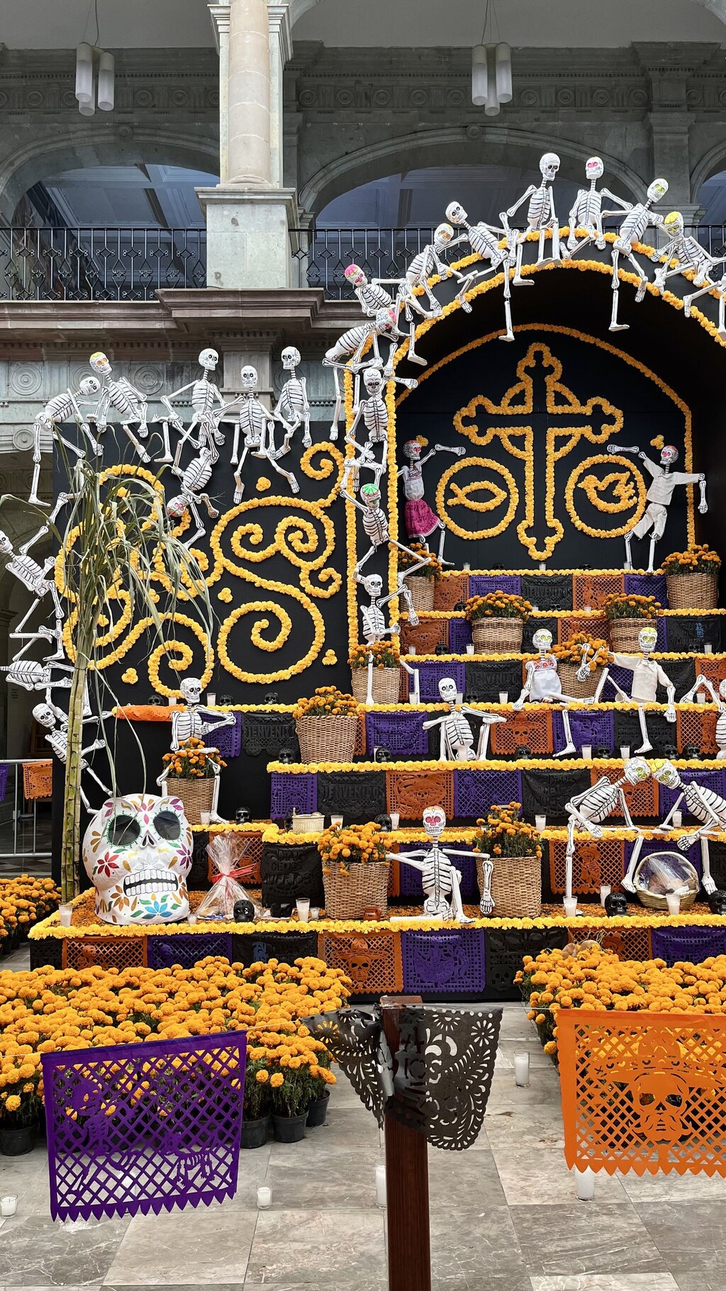Mexican families celebrating the Day of the Dead set up altars in the city, at home or in the cemetery. The altars display photos of the deceased family members and are decorated with the typical orange “cempasuchil” flowers. According to Mexican belief, the deceased have the opportunity to visit their families on earth once a year (November 1st and 2nd) if they have put up their photo. In Oaxaca, these altars can be seen throughout the city — in markets, in cafes, and in public squares throughout the city. A particularly large, great altar can be found in the town hall of Oaxaca. This is magnificently decorated with small skeletons, garlands and many of the typical “Cempasúchil” flowers. If you want to marvel at the town hall altar, all you have to do is stand in line in front of the town hall and wait patiently. Entry to the town hall courtyard is free.